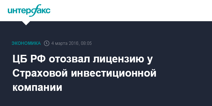 ЦБ РФ отозвал лицензию у Страховой инвестиционной компании