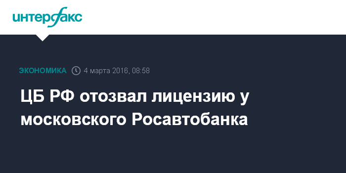 Москва. 4 марта. INTERFAX.RU - Центральный банк РФ отозвал лицензию на осуществление банковских операций у московского Росавтобанка, говорится в сообщении ЦБ.