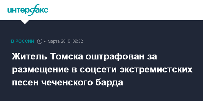 Житель Томска оштрафован за размещение в соцсети экстремистских песен чеченского барда