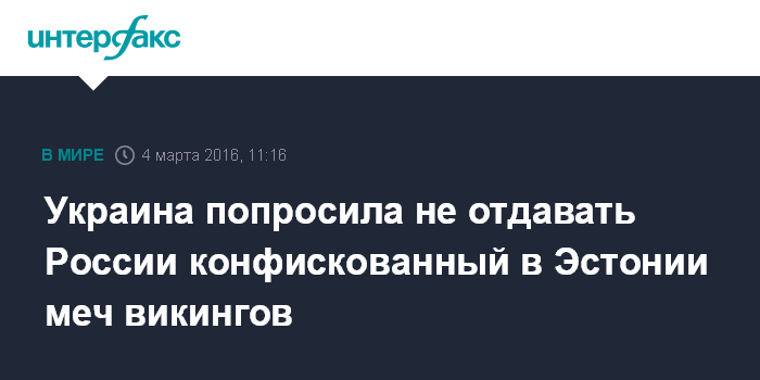 Москва. 4 марта. INTERFAX.RU -Украина попросила власти Эстонии не отдавать России конфискованный эстонскими таможенниками меч эпохи викингов. Как сообщил в пятницу портал телерадиовещания ERR, с соответствующим ходатайством в МИД Эстонии обратился посол Украины в Таллине Виктор Крыжановский.