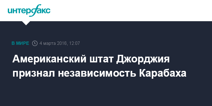 Москва. 4 марта. INTERFAX.RU - Палата представителей американского штата Джорджия приняла резолюцию о признании независимости самопровозглашенной Нагорно-Карабахской Республики, сообщает пресс-служба МИД Армении.
