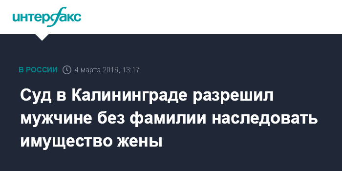 Москва. 4 марта. INTERFAX.RU - Районный суд Калининграда встал на сторону гражданина, который не мог получить наследство жены, так как ни в одном удостоверении личности не была указана его фамилия.