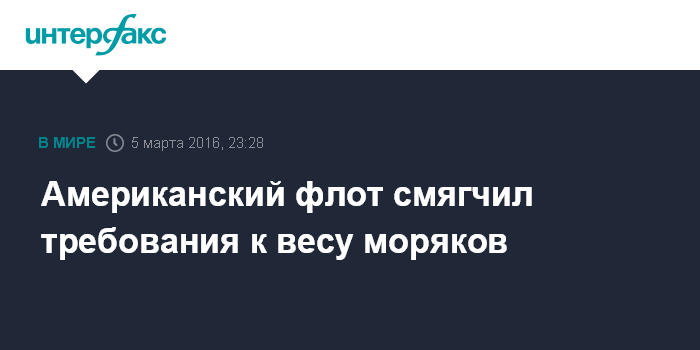 Москва. 5 марта. INTERFAX.RU - Американский военно-морской флот смягчил нормативы, по которым определяется наличие лишнего веса у военнослужащих, сообщило в субботу агентство Associated Press.