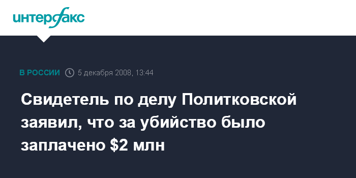 Москва. 5 декабря. INTERFAX.RU - Один из свидетелей допрошенных по делу об убийстве обозревателя "Новой газеты" Анны Политковской сообщил, что за убийство журналистки было заплачено $2 млн долларов.