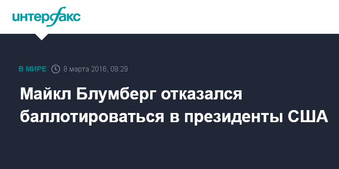 Москва. 8 марта. INTERFAX.RU - Бывший мэр Нью-Йорка миллиардер Майкл Блумберг отказался от участия в президентских выборах 2016 года в США, сообщает Bloomberg View.