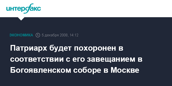 Москва. 5 декабря. INTERFAX.RU - Патриарх всея Руси Алексий II будет похоронен в Богоявленском Елоховском соборе в Москве.