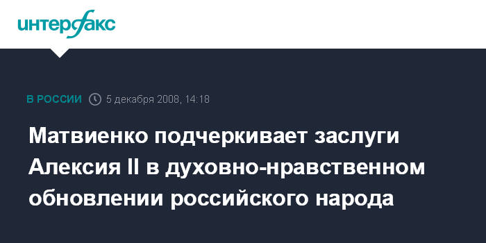 Матвиенко подчеркивает заслуги Алексия II в духовно-нравственном обновлении российского народа