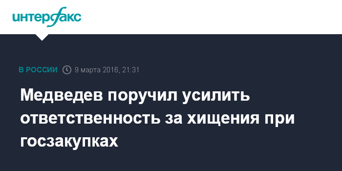 Минюсту России, Минэкономразвития, Минфину и ФАС России "представить в установленном порядке предложения по внесению в законодательство Российской Федерации изменений, предусматривающих усиление уголовной ответственности и повышение эффективности других механизмов предотвращения хищений при осуществлении закупок товаров, работ, услуг для обеспечения государственных и муниципальных нужд", говорится в тексте поручений Медведева, размещенном на сайте.