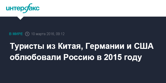 Москва. 10 марта. INTERFAX.RU - Въездной туристический поток в Россию в минувшем году вырос на 13,7% по сравнению с 2014 годом, до 2,93 млн поездок, лидерами по числу туристов стали Китай, Германия и США, сообщила порталу "Интерфакс-Туризм" в четверг пресс-секретарь Российского союза туриндустрии (РСТ) Ирина Тюрина со ссылкой на данные Росстата.