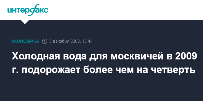 Москва. 5 декабря. INTERFAX.RU - С 1 января 2009 г. стоимость холодного водоснабжения в столице в среднем подорожает на 26,2%, сообщила в пятницу "Интерфаксу" пресс-секретарь ГУП "Мосводоканал" Лариса Данилина. По ее словам, соответствующее решение принято Региональной энергетической комиссии.