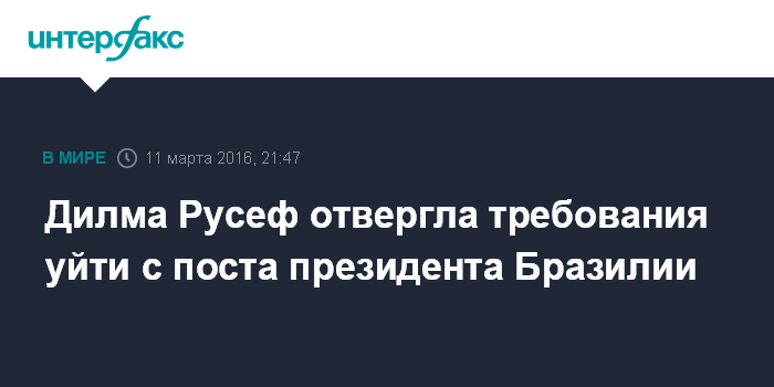 Москва. 11 марта. INTERFAX.RU - Президент Бразилии Дилма Русеф подтвердила в пятницу, что не намерена покидать свой пост, несмотря на растущее давление со стороны оппозиции.