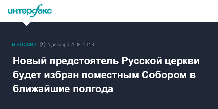 Москва. 5 декабря. INTERFAX.RU - Священный Синод Русской православной церкви в субботу выберет местоблюстителя РПЦ, новый предстоятель церкви будет избран поместным Собором в течение полугода, сообщили в московской патриархии.