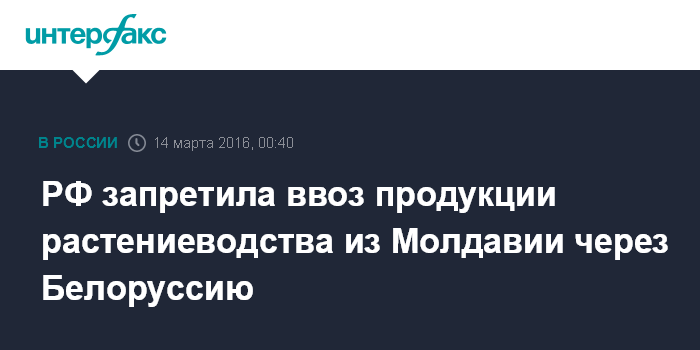 Москва. 14 марта. INTERFAX.RU - Россия с 14 марта запрещает ввоз продукции растениеводства из Молдавии через Белоруссию.