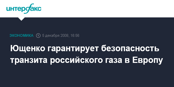 Москва. 5 декабря. INTERFAX.RU - Президент Украины Виктор Ющенко гарантирует, что российский природный газ, который транспортируется в Европу через украинскую территорию, дойдет до европейского потребителя. Ющенко заявил об этом в интервью агентству AFP, сообщает пресс- службы главы государства в пятницу.