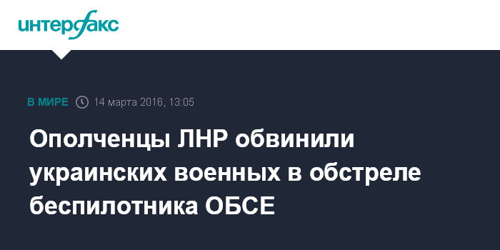 Москва. 14 марта. INTERFAX.RU - В самопровозглашенной Луганской народной республике утверждают, что украинские военные обстреляли беспилотный летательный аппарат Специальной мониторинговой миссии ОБСЕ, осуществлявший мониторинг так называемой "серой зоны".