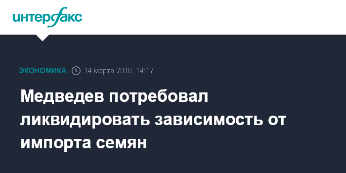 Москва. 14 марта. INTERFAX.RU - Премьер РФ Дмитрий Медведев указал на необходимость ликвидации зависимости от импорта семенного и племенного материалов для сельского хозяйства.