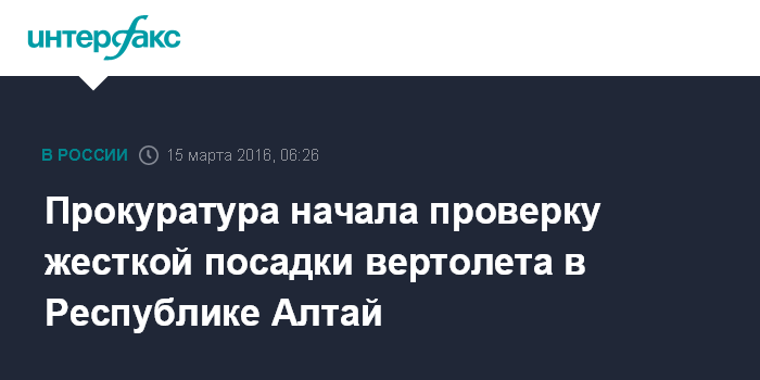 Москва. 15 марта. INTERFAX.RU - Горно-Алтайская транспортная прокуратура по данному факту проводит проверку исполнения законодательства о безопасности полетов по факту жесткой посадки вертолета Robinson R-66, произошедшей накануне в Республике Алтай. Как сообщает Западно-Сибирская транспортная прокуратура, воздушное судно получило значительные повреждения.