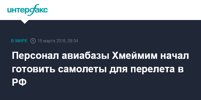 Москва. 15 марта. INTERFAX.RU - Технический персонал российской авиабазы Хмеймим приступил к подготовке самолетов для осуществления дальнего перелета на аэродромы базирования в Российской Федерации.