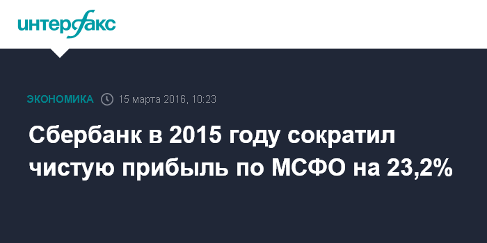 Москва. 15 марта. INTERFAX.RU – Сбербанк в 2015 году сократил чистую прибыль по международным стандартам финансовой отчетности (МСФО) на 23,2% - до 222,9 млрд рублей (с 290,3 млрд рублей в 2014 году), говорится в отчете банка.