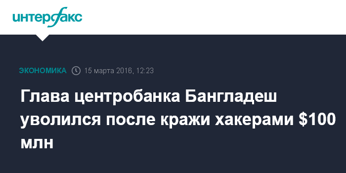 Москва. 15 марта. INTERFAX.RU – Председатель центрального банка Бангладеш Атиур Рахман во вторник ушел в отставку из-за февральской хакерской атаки, в результате которой злоумышленники украли более $100 млн из золотовалютных резервов страны, передает BBC.