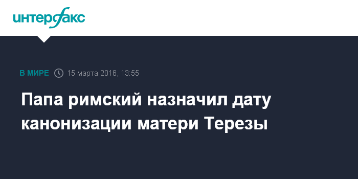 Москва. 15 марта. INTERFAX.RU - Католическая монахиня, мать Тереза Калькуттская, скончавшаяся в 1997 году, будет канонизирована 4 сентября, объявил во вторник папа римский Франциск.