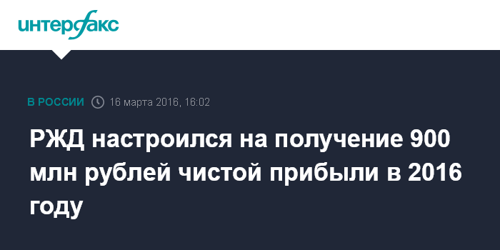 Москва. 16 марта. INTERFAX.RU - ОАО "Российские железные дороги" планирует выйти в 2016 году на чистую прибыль в размере 900 млн рублей, заявил президент компании Олег Белозеров.