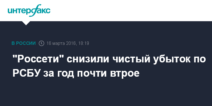 Москва. 16 марта. INTERFAX.RU - ПАО "Россети" зафиксировало чистый убыток по РСБУ за 2015 год в размере 18,2 млрд руб., что почти в три раза ниже аналогичного показателя 2014 года, следует из отчетности компании.