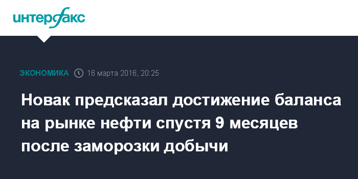 Москва. 16 марта. INTERFAX.RU - В случае достижения договоренности о заморозке нефтедобычи баланс на рынке нефти может наступить примерно через 9 месяцев. Такое мнение высказал журналистам министр энергетики Александр Новак.