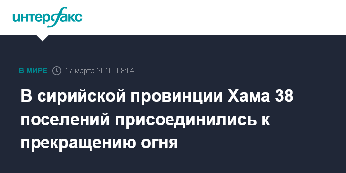 Москва. 17 марта. INTERFAX.RU - Заявочные листы о присоединении к прекращению огня в Сирии подписали 38 населенных пунктов провинции Хама, еще 10 обращений поступило за последнюю неделю, сообщил журналистам начальник группы примирения в провинции Хама подполковник Герман Руденко.
