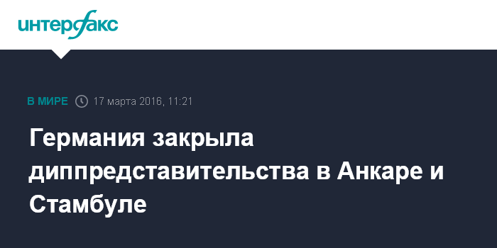 Москва. 17 марта. INTERFAX.RU - Германия временно закрыла свое посольство в Анкаре из-за возможной атаки, а также временно прекратила работу Генерального консульства в Стамбуле, сообщает Deutsche Welle со ссылкой на министерство иностранных дел Германии.