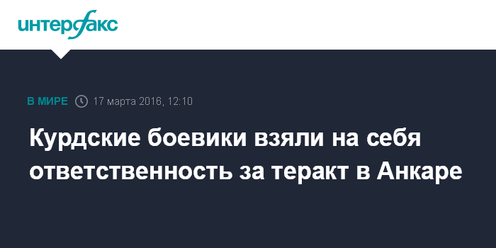 Москва. 17 марта. INTERFAX.RU - Группировка курдских боевиков "Ястребы свободы Курдистана" взяла на себя ответственность за теракт, совершенный на прошлой неделе в Анкаре, сообщают западные СМИ со ссылкой на заявление группировки.
