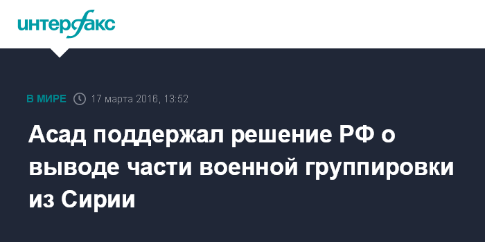 "Решение о выводе существенной части наших военнослужащих и техники согласовано с президентом Сирии Башаром Асадом, который был заранее информирован о наших планах и поддержал их", - заявил Путин в ходе встречи с военнослужащими, участвовавшими в операции в Сирии.
