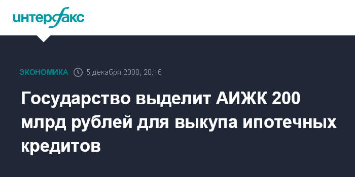 Москва. 5 декабря. INTERFAX.RU - Государство выделит Агентству по ипотечному жилищному кредитованию (АИЖК) 200 млрд рублей в 2009 г. для выкупа ипотечных кредитов, заявил вице-премьер, министр финансов Алексей Кудрин, комментируя принятые в пятницу на совещании правительства решения по вопросам, связанным с ипотекой.