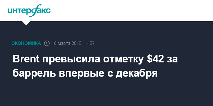 Майские фьючерсы на нефть марки Brent на лондонской бирже ICE Futures к 13:57 по Москве стоили 42,08 доллара за баррель. Котировки превысили отметку в 42 доллара за баррель впервые с седьмого декабря.