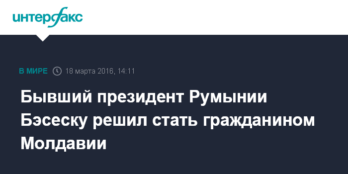 Москва. 18 марта. INTERFAX.RU - Бывший президент Румынии Траян Бэсеску подал официальное заявление о принятии гражданства Молдавии, сообщили в пятницу молдавские СМИ.