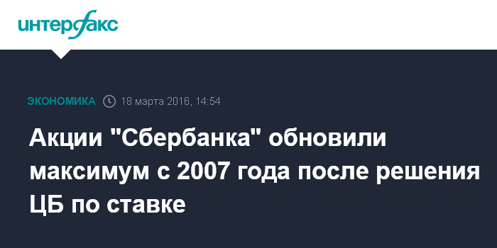Москва. 18 марта. INTERFAX.RU - Акции Сбербанка России днем в пятницу обновили максимум с 2007 года на фоне укрепления рубля после решения Банка России оставить ключевую процентную ставку неизменной на уровне 11% годовых.