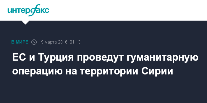 Москва. 19 марта. INTERFAX.RU - Евросоюз и Турция намерены проводить совместную гуманитарную операцию по помощи сирийским беженцам не только на турецкой территории, но также в Сирии, говорится в заявлении по итогам саммита, в котором участвовали лидеры стран ЕС и премьер-министр Турции Ахмет Давутоглу.