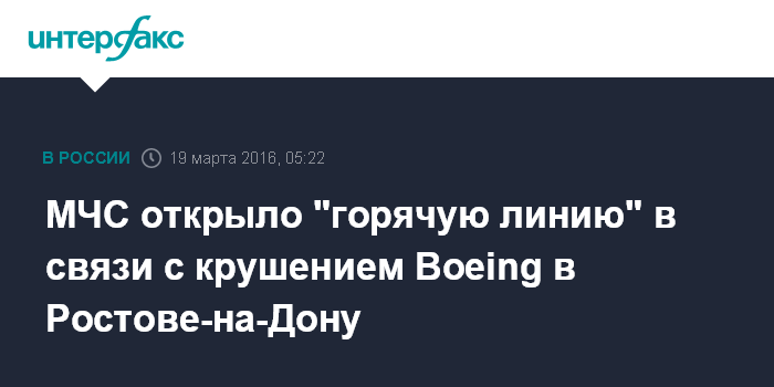 Москва. 19 марта. INTERFAX.RU - МЧС открыло "горячую линию" в связи с авиакатастрофой в Ростове-на-Дону, сообщили в пресс-службе МЧС России.