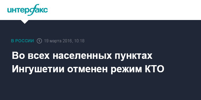 Москва. 19 марта. INTERFAX.RU - Режим контртеррористической операции, действовавший в некоторых населенных пунктах Ингушетии, отменен решением оперативного штаба в связи с отсутствием угроз террористического характера, сообщил "Интерфаксу" представитель пресс-службы УФСБ по Ингушетии.