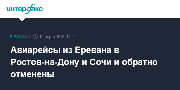 Москва. 19 марта. INTERFAX.RU - Авиарейсы из Еревана в Ростов-на-Дону и Сочи, запланированные в субботу в промежутке с 11:10 (10:10 по Москве) до 15:30 (14:30 по Москве), отменены.