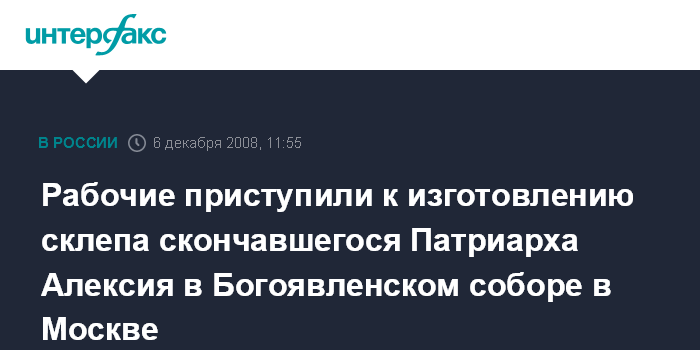 Рабочие приступили к изготовлению склепа скончавшегося Патриарха Алексия в Богоявленском соборе в Москве