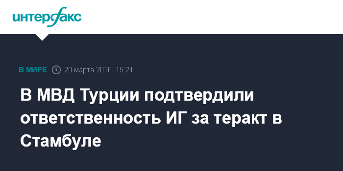 Москва. 20 марта. INTERFAX.RU - Глава МВД Турции Эфкан Ала в воскресенье подтвердил, что смертник, совершивший накануне теракт в Стамбуле, был турком из группировки "Исламское государство" (ИГ, запрещена в РФ), сообщает турецкая газета Hurriyet.