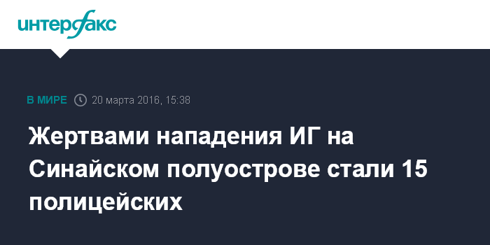 Москва. 20 марта. INTERFAX.RU - Не менее 15 полицейских погибли в Египте на севере Синайского полуострова в результате нападения боевиков группировки "Исламское государство" (ИГ, запрещена в РФ) на КПП у города Эль-Ариш, сообщает в воскресенье сайт ливанского издания The Daily Star.