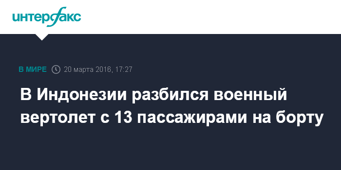 Москва. 20 марта. INTERFAX.RU - Вертолет армии Индонезии, перевозивший 13 человек, в воскресенье потерпел крушение в центральной части индонезийского острова Сулавеси, сообщает сайт ливанского издания The Daily Star.