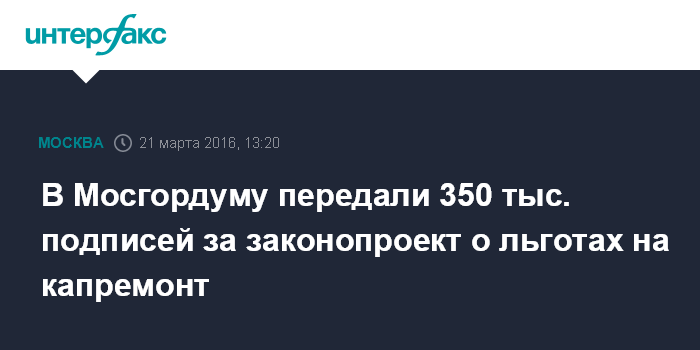 Москва. 21 марта. INTERFAX.RU - "Единая Россия" передала в столичный парламент 350 тыс. подписей в поддержку законопроекта о льготах за капитальный ремонт для одиноких москвичей старше 70 лет.