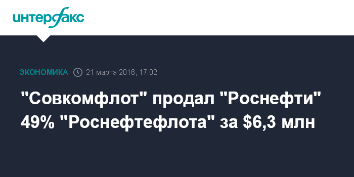 Москва. 21 марта. INTERFAX.RU - ПАО "Совкомфлот" (головная компания одноименной группы) продало НК "Роснефть" 49% ЗАО "Роснефтефлот" летом прошлого года, говорится в отчете компании за 2015 год.