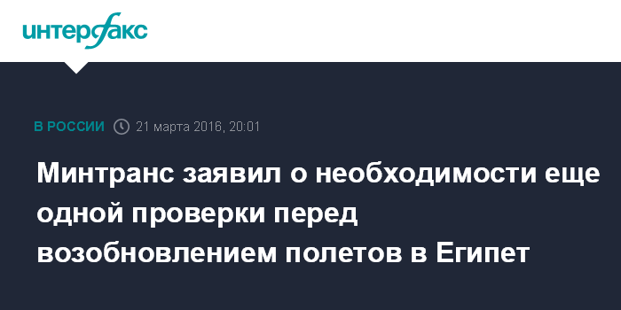 "Понимаем, что всем хочется скорее открыть вновь эти направления, и, в общем-то, политических препятствий к этому никаких нет. Но мы ждем подтверждения, что все эти требования (по безопасности полетов - ИФ) выполнены, после чего группа специалистов-экспертов выедет на место, проверит, как действительно выполнены эти требования, и эта проверка будет очень тщательной и далеко не краткосрочной, после чего уже может быть подготовлено решение о возобновлении авиасообщения с Египтом, которое должно быть утверждено руководством страны", - сказал Соколов в эфире телеканала "Россия 24" (ВГТРК).