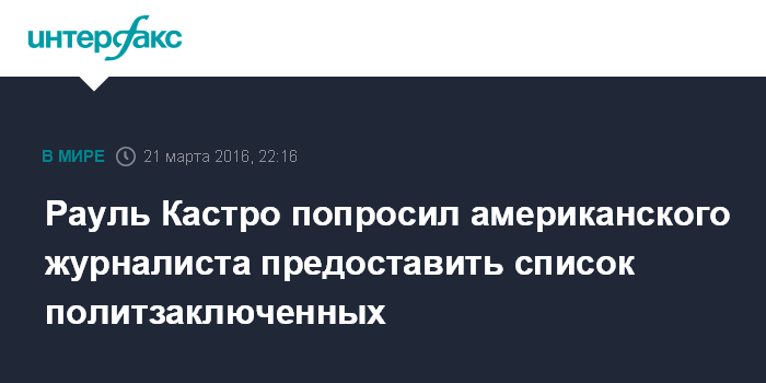 Москва. 21 марта. INTERFAX.RU - Кубинский лидер Рауль Кастро пообещал журналисту, спросившего его о политзаключенных, отпустить их, если тот даст ему имена тех, кто, по его мнению, является политзаключенными в этой стране.