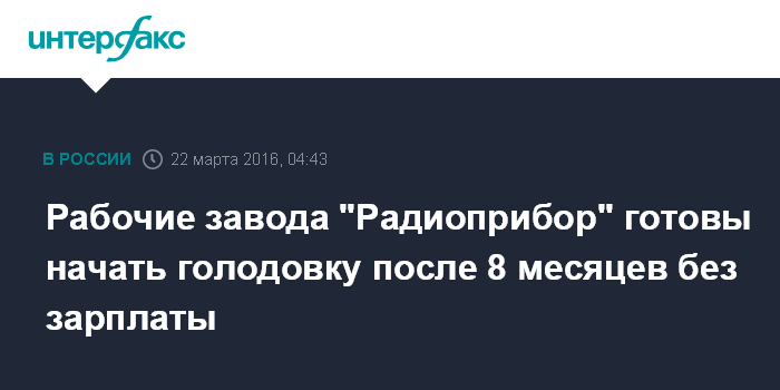 Москва. 22 марта. INTERFAX.RU - Голодовку намерены объявить сотрудники завода "Радиоприбор" во Владивостоке из-за длительной задержки заработной платы.