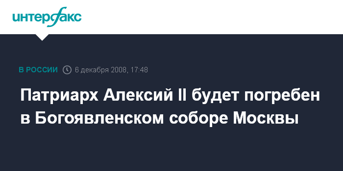 Москва. 6 декабря. INTERFAX.RU - Погребение патриарха Московского и всея Руси Алексия II состоится во вторник в 13:00 в московском Богоявленском соборе. "Погребен будет Святейший патриарх в Богоявленском соборе в 13:00", - сказал журналистам по итогам заседания Священного Синода глава пресс-службы Московской патриархии Владимир Вигилянский. Он также добавил, что отпевание Алексия II состоится в тот же день, во вторник, в храме Христа Спасителя.